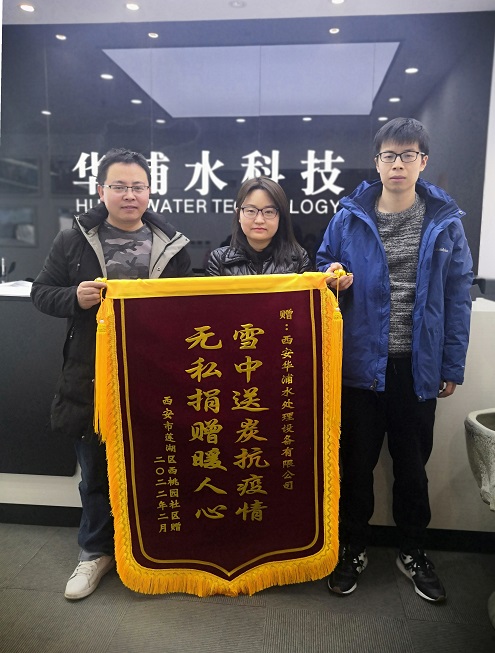 2月21日,西安市蓮湖區西桃園社區副主任李超和西桃園社區第二黨支部副書記蒲少鵬來到華浦水科技,他們代表西桃園社區防疫工作者向華浦水科技贈送了一面印著“雪中送炭抗疫情,無私捐贈暖人心”的紅色錦旗,感謝華浦總裁張玫和生產工程部經理張海軍在疫情期間沖鋒在前、助力一線疫情防控,為保障西桃園社區防疫人員后勤工作所付出的努力和貢獻。